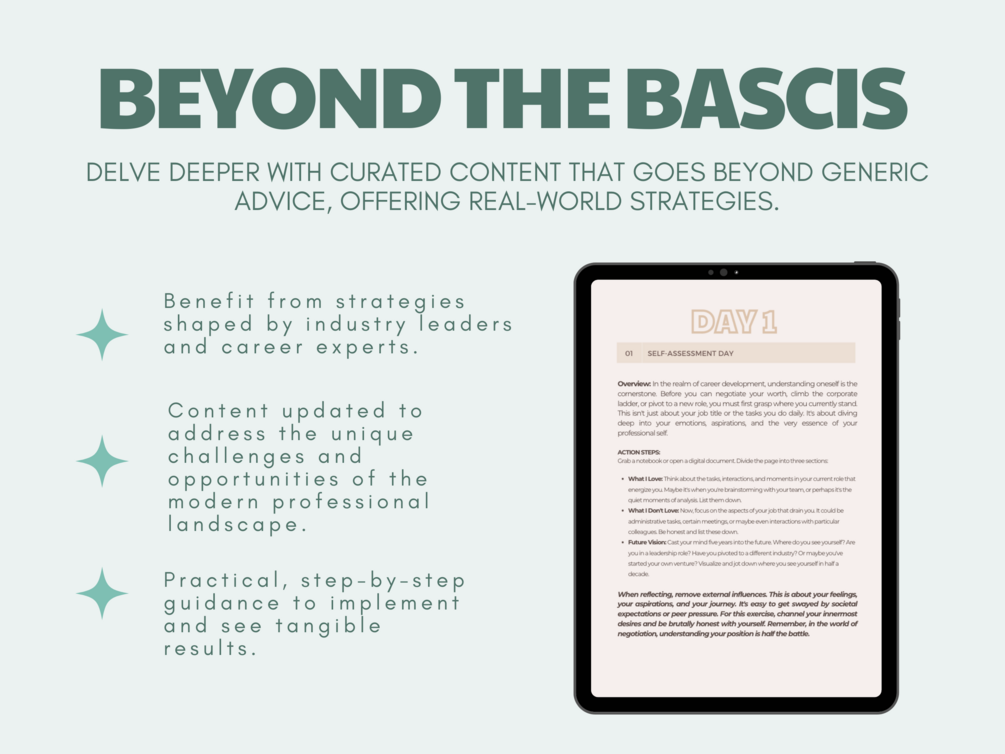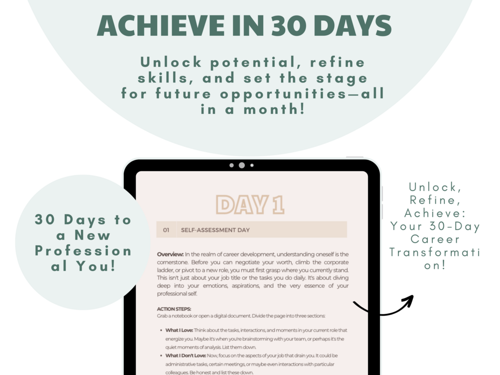 Perfect for those new to the job market, professionals eyeing a career pivot, or anyone aiming for that next promotion. In just a month, experience tangible growth and clarity in your career journey. Secure your guide now and propel your professional trajectory to new heights!